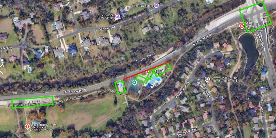 - Brushy Creek Regional Trail parking lot on the south side of Brushy Creek Road