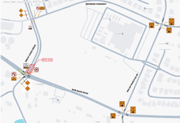 Due to road work taking place under the direction of Williamson County, there will be a temporary closure of Great Oaks Drive between Sam Bass Road and Behrens Pkwy. this Monday, June 9, from 9 a.m. to 5 p.m. Traffic will be detoured via Walsh Ranch Boulevard as indicated by the map.
